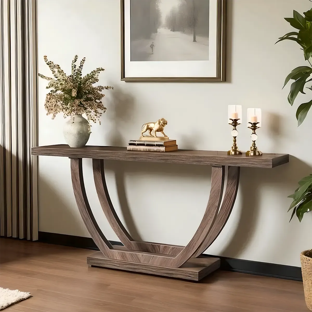 The design adapts to many styles. In a minimal home it reads as a sculptural line. In a layered setting it becomes a quiet bridge among patterns and colors. The table pairs with round and rectangular mirrors above and works with both light and dark wall paint. The warm wood tone blends with woven runners and leather accessories and stands comfortably beside metal fixtures.
